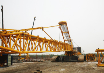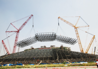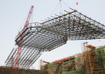 2、跨度大,超重量,3塊網(wǎng)架跨度過(guò)大約90m,最重一區(qū)網(wǎng)架約384噸,根據(jù)工程結(jié)構(gòu)特點(diǎn),使用滑移安裝方法易造成施工中網(wǎng)架滑動(dòng),故只能采用分區(qū)現(xiàn)場(chǎng)拼裝后吊裝的方法,即采用"雙機(jī)抬升",完成網(wǎng)架就位。這也是此工程的最大的重點(diǎn)與難點(diǎn)。
