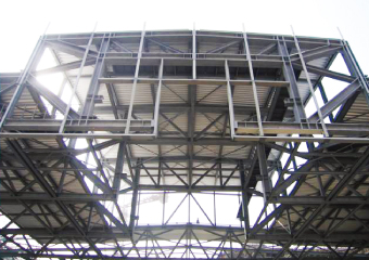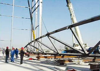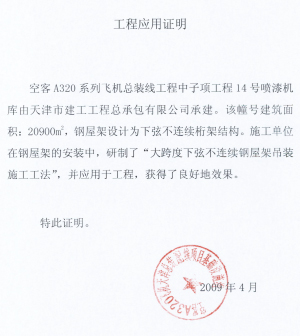 屋架下弦標高誤差為+5mm,鋼柱垂直度偏差為+3mm,完全符合設(shè)計要求,得到設(shè)計和德方的認可和贊賞。編制的《大跨度下弦不連續(xù)屋架吊裝施工工法》已獲得國家級工法。工程獲得中國安裝工程優(yōu)質(zhì)獎(安裝之星)。
