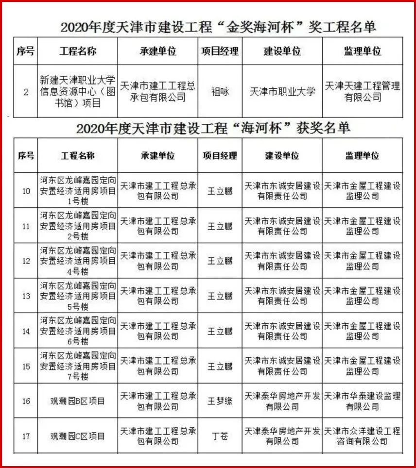 由總承包公司承建的天津職業(yè)大學(xué)信息資源中心(圖書館)項(xiàng)目榮獲“金獎(jiǎng)海河杯”觀潮園B、C區(qū)項(xiàng)目龍峰嘉園定向安置經(jīng)濟(jì)適用房項(xiàng)目榮獲“海河杯”獎(jiǎng)。三項(xiàng)工程共計(jì)榮獲9尊“海河杯”。