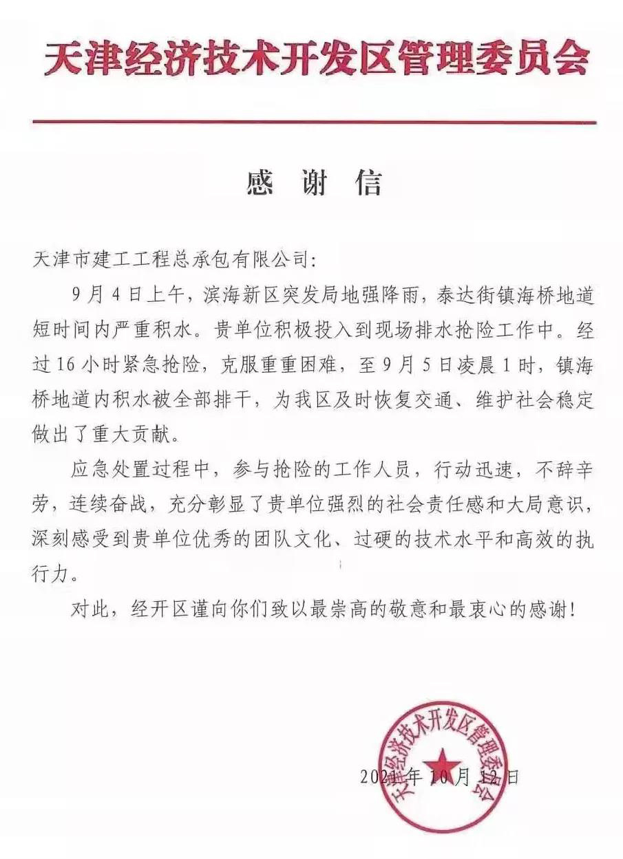 總承包公司收到天津經(jīng)開(kāi)區(qū)管委會(huì)感謝信