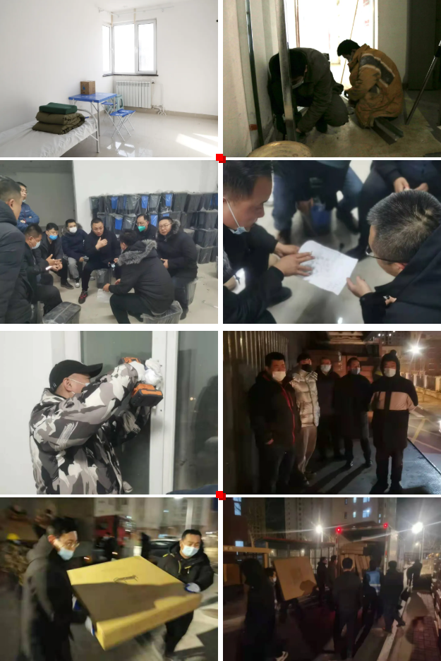 深夜時(shí)分,氣溫下降、寒風(fēng)刺骨,使人不寒而栗,但三九寒冬難阻總包人的沖天干勁。此時(shí)此刻,小峰總等集團(tuán)領(lǐng)導(dǎo)再次來(lái)到現(xiàn)場(chǎng)看望一線員工,給了大家以巨大的鼓舞。現(xiàn)場(chǎng)60余人組成多條流水線,利用人力肩抗手抬,硬是將1200套床鋪、被褥及1700臺(tái)熱水器上樓入戶。同時(shí),在每戶為熱水器吊掛打眼,為小區(qū)安裝300米隔離圍擋。直至清晨6點(diǎn),各項(xiàng)任務(wù)得以順利完成。