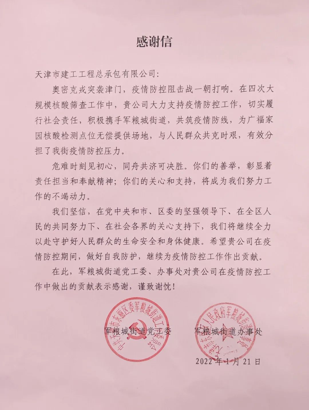 為感謝二分公司對抗疫工作的支持,1月27日上午,東麗區(qū)街道黨工委委員、街道辦事處副主任劉孝民及東麗區(qū)軍糧城街道公共服務(wù)辦公室主任費金樹來到項目部,送來錦旗與感謝信,對廣福項目在疫情防控期間為軍糧城街道所作出的工作表示衷心感謝,對項目部人員主動投身疫情防控工作,不懼風險、無私奉獻的精神給予高度認可。