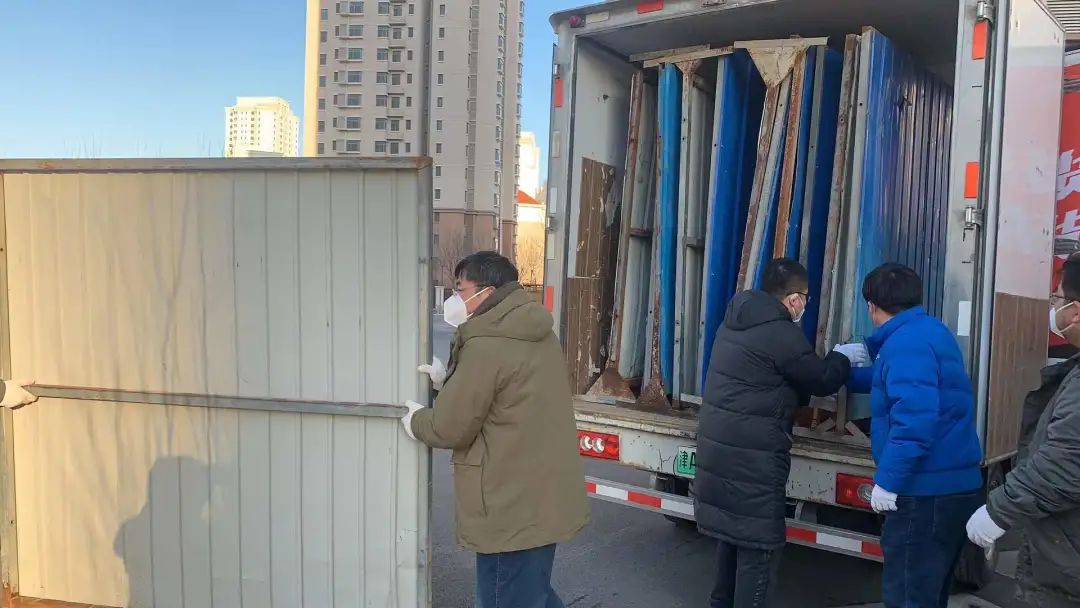 臨危受命的總承包一分公司、二分公司及內(nèi)蒙古區(qū)域公司迅速組織集結(jié)。在津的管理人員不論是在與家人團(tuán)聚包餃子,還是在利用難得的回津假期給孩子輔導(dǎo)功課,都二話不說(shuō),穿起外套就走。通過(guò)電話聯(lián)絡(luò)后,他們兵分兩路:一路奔赴隔離點(diǎn)親和靜園,勘查現(xiàn)場(chǎng),統(tǒng)計(jì)用材用料;另一路直接聯(lián)系建工總承包北辰材料廠,對(duì)圍擋板進(jìn)行挑選和裝車(chē),以最快速度確保人、材、工具到位。