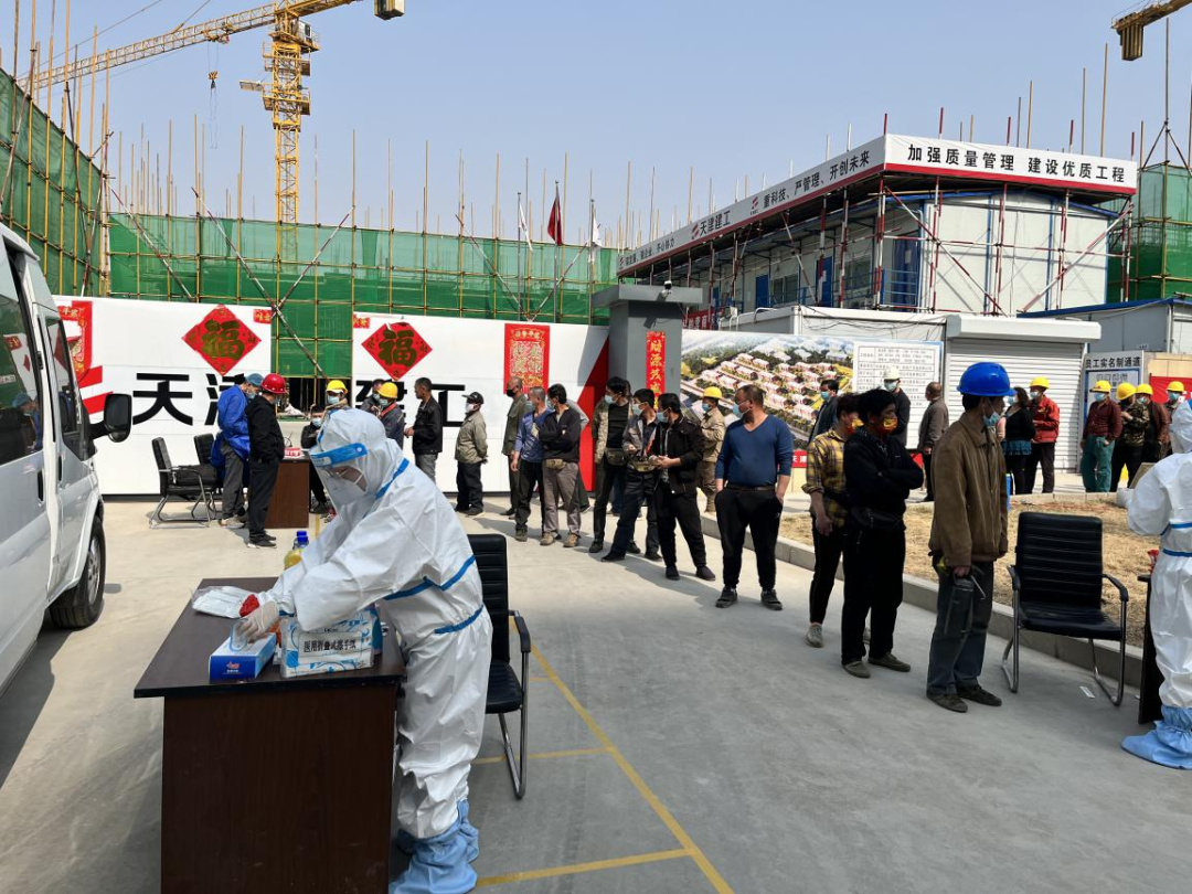 決定作出后,團(tuán)泊墅項(xiàng)目立即啟動(dòng)疫情防控應(yīng)急預(yù)案。項(xiàng)目目前全員230余人,靜海區(qū)核酸檢測(cè)點(diǎn)距離項(xiàng)目較遠(yuǎn),若自行前往檢測(cè)點(diǎn)進(jìn)行檢測(cè),不僅耽誤現(xiàn)場(chǎng)施工,而且會(huì)增加接觸交叉感染的風(fēng)險(xiǎn)。