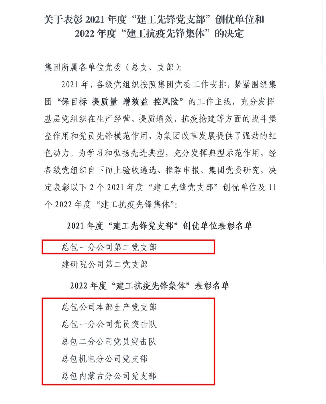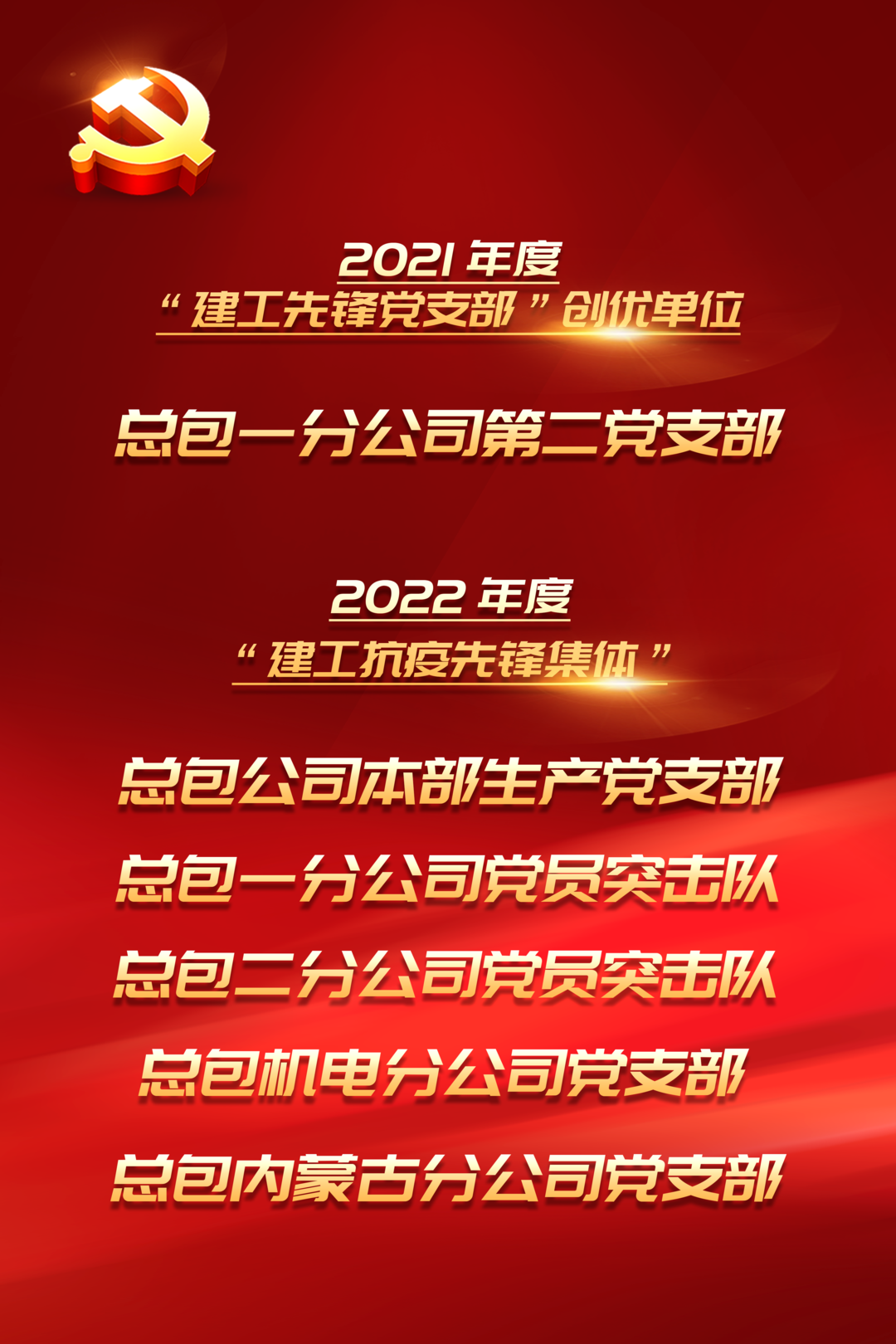 總包一分公司第二黨支部被授予2021年度“建工先鋒黨支部”創(chuàng)優(yōu)單位稱號(hào);總包本部生產(chǎn)黨支部、一分公司黨員突擊隊(duì)、二分公司黨員突擊隊(duì)、機(jī)電分公司黨支部、內(nèi)蒙古分公司黨支部被授予2022年度“建工抗疫先鋒集體”稱號(hào)。