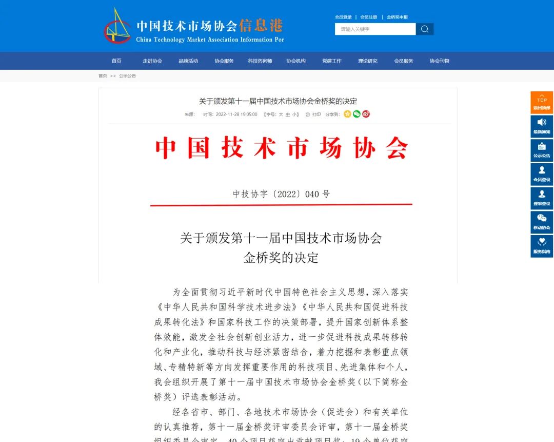 中國技術(shù)市場協(xié)會金橋獎是全國技術(shù)市場領(lǐng)域最高獎項,由國家科學技術(shù)獎勵工作辦公室批準設(shè)立,每兩年評選一次,具有極高的權(quán)威性和公正性,是我國科技成果轉(zhuǎn)化領(lǐng)域的至高榮譽。該項獎勵的設(shè)立是作為科技界最高獎項“國家科技進步獎”的補充獎項、原國家科委開展的“全國技術(shù)市場金橋獎”的延續(xù),以促進科技成果的轉(zhuǎn)化,推動我國技術(shù)市場的繁榮和發(fā)展。