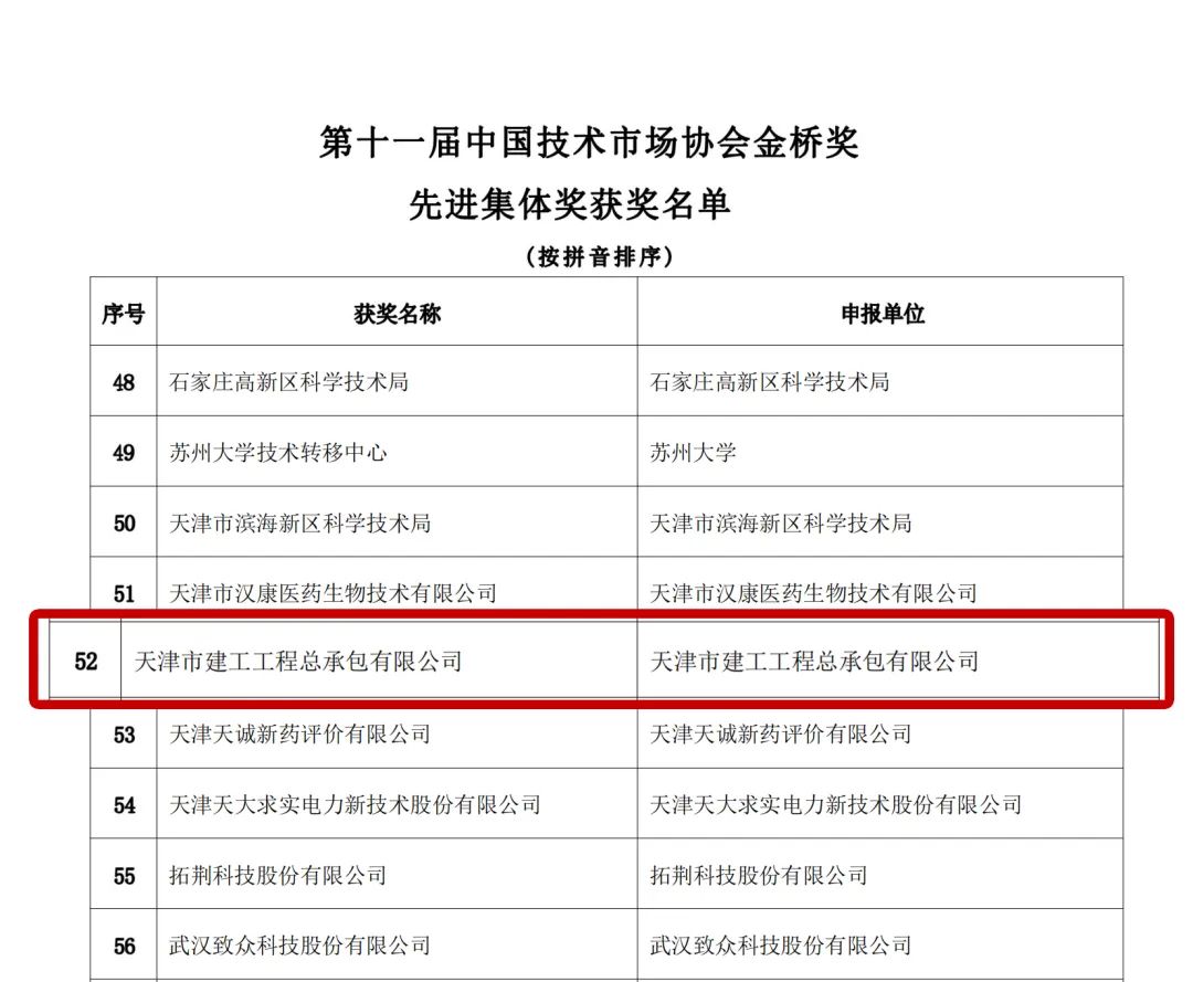 近日,由中國技術(shù)市場協(xié)會主辦的第十一屆中國技術(shù)市場金橋獎評審結(jié)果揭曉,我市共有35家企事業(yè)單位及個人獲此殊榮。其中,總承包公司榮獲金橋獎先進集體獎,這既是總承包公司首次也是天津市建筑企業(yè)首次榮獲該獎項。