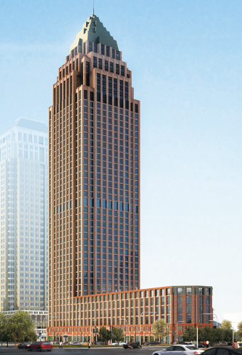 該工程建筑面積181000m2, 建筑高度250m , 基坑開(kāi)挖深度-20m。工程地處市區(qū)中心地帶,施工場(chǎng)狹小,周邊環(huán)境復(fù)雜,歷史風(fēng)貌建筑距基坑邊緣僅為5m。施工中通過(guò)采用地連墻+內(nèi)支撐支護(hù)技術(shù)、科學(xué)合理的土方開(kāi)挖技術(shù)、信息化施工技術(shù),保護(hù)了周邊建筑物與道路的安全,為深基坑施工提供了安全保障。